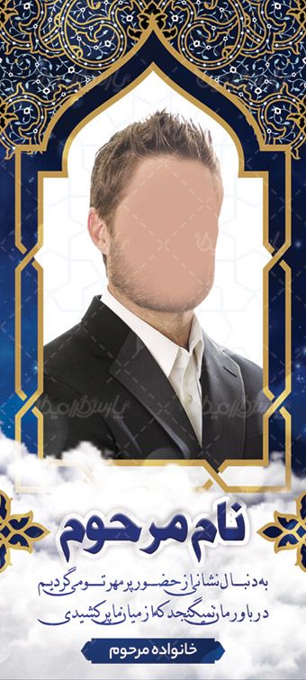 طرح آگهی ترحیم، آگهی ترحیم، تصویر فرد، کادر اسلیمی، کادر تذهیب، طرح محراب، ابر و متن شعر به دنبال نشانی از حضور پر مهر تو میگردیم / در باورمان نمیگنجد که از میان ما پرکشیدی، اطلاعیه ترحیم، استند ترحیم