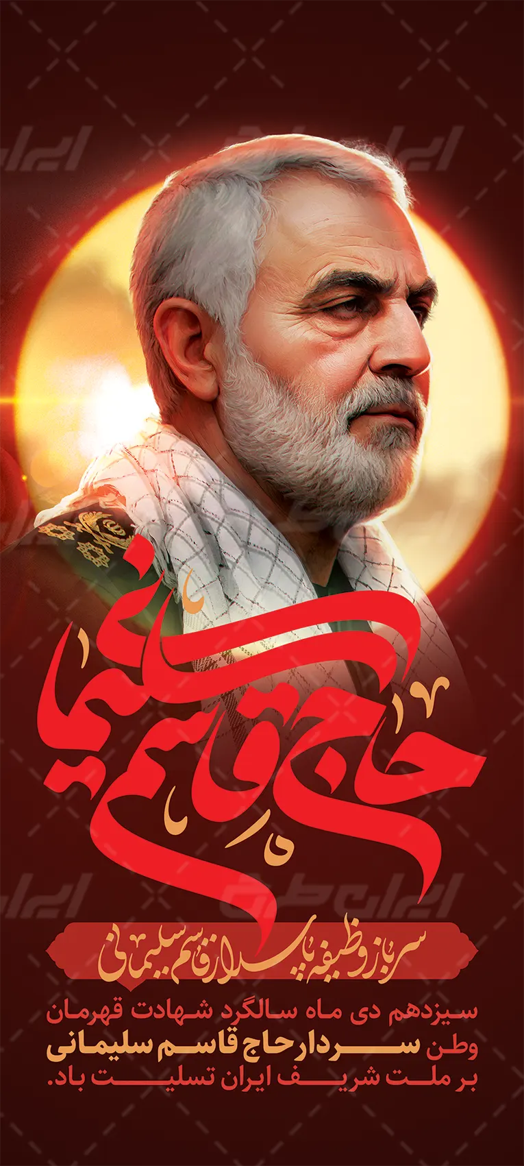 بنر شهادت سردار قاسم سلیمانی ، توسط تیم حرفه ای ایران طرح جهت استفاده کاربران سایت طراحی و به صورت لایه باز در دسترس کاربران قرار گرفته است.