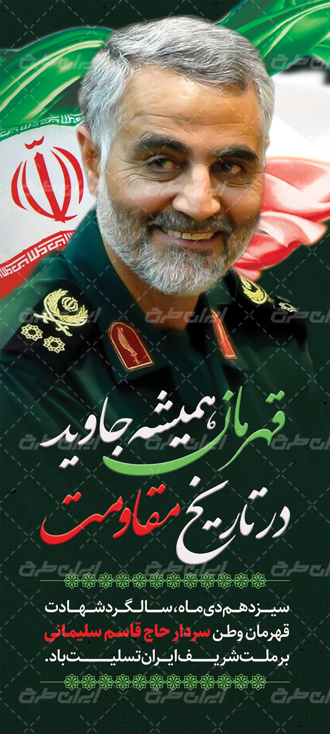 تصویر سردار شهید سلیمانی و متن تسلیت سالگرد شهادت حاج قاسم سلیمانی می باشد که توسط تیم ایران طرح طراحی شده است.