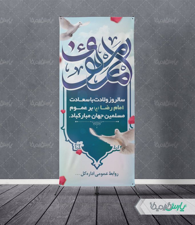 طرح بنر لایه باز ولادت امام رضا (ع) با رنگ زمینه آبی و به صورت عمودی طراحی شده است .
