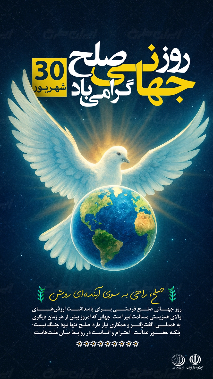 تصویر کبوتر و متن مرتبط با روز جهانی صلح می باشد که توسط طراحان ایران طرح در نرم افزار فتوشاپ طراحی شده است.