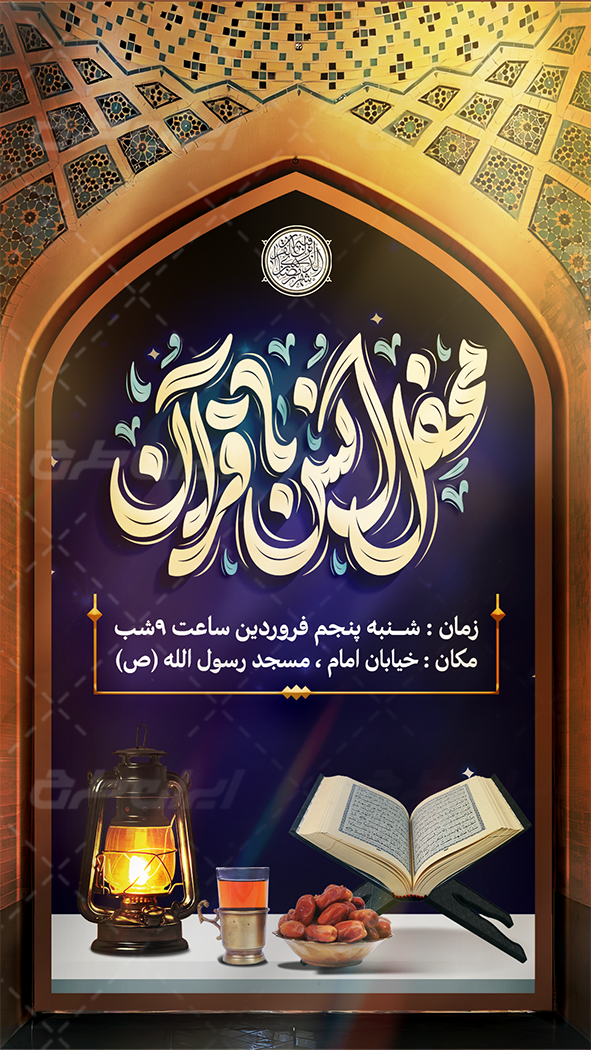 طرح پست و استوری محفل انس با قرآن در نرم افزار فتوشاپ به صورت لایه باز طراحی شده و شامل تصویر قرآن و فانوس می باشد.
