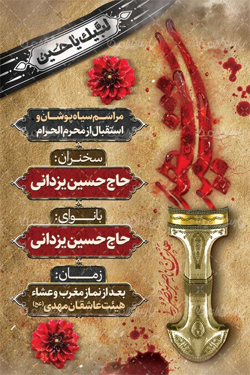 طرح بنر اطلاع رسانی محرم، بنر لایه باز محرم، طرح لایه باز بنر ایام محرم، متن تایپوگرافی سید شهید، لکه خون، دسته شمشیر، گل، کادر مذهبی، کار تذهیب، کادر اسلیمی، متن نستعلیق هل من ناصر ینصرنی، سربند مشکی لبیک یا حسین