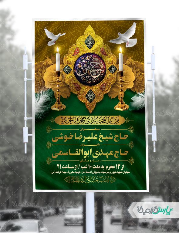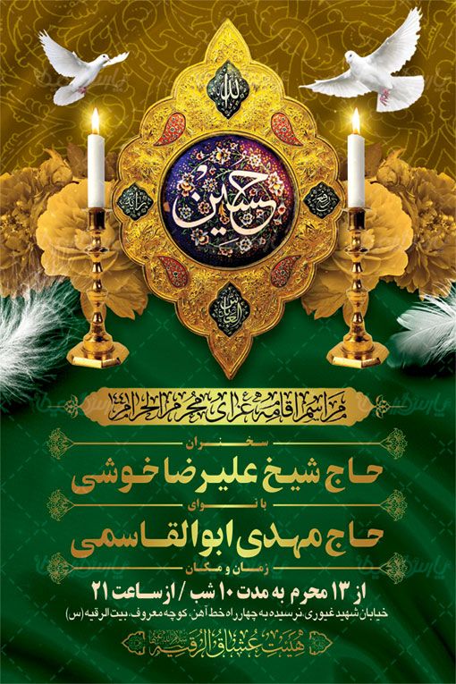 طرح بنر اطلاع رسانی محرم، بنر لایه باز محرم، طرح لایه باز بنر ایام محرم، تایپوگرافی حسین، طرح گل، کتیبه محرم، شمعدونی مذهبی، شمع، کادر مذهبی، کادر تذهیب، پر، متن مراسم دهه اول محرم الحرام