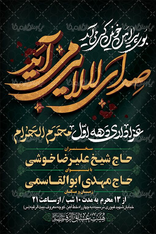 طرح بنر اطلاع رسانی محرم، بنر لایه باز محرم، طرح لایه باز بنر ایام محرم، تایپوگرافی صدای لالایی می آید، بوی پیراهن خونین می آید، متن عزاداری دهه اول محرم الحرام، تذهیب، حاشیه تذهیب، لکه خون