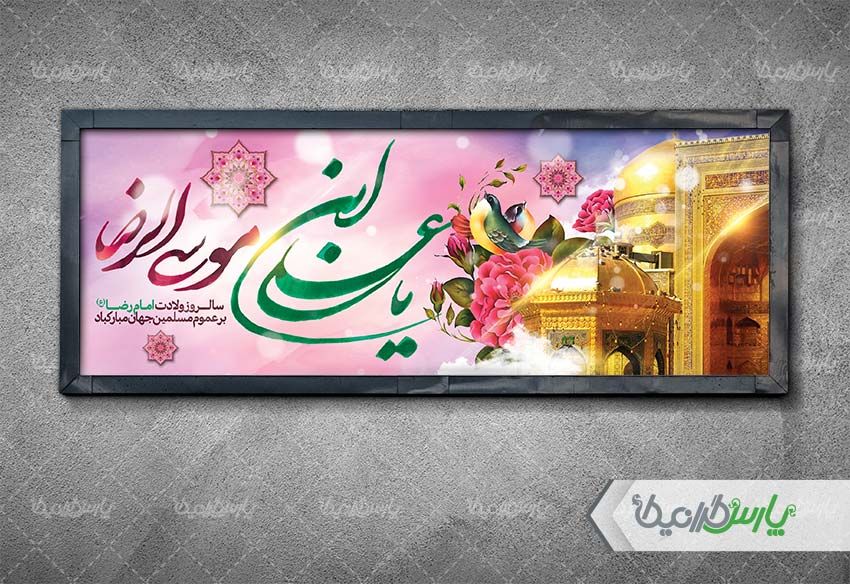 همانطور که در تصویر مشاهده می کنید ، بنر ولادت امام رضا بصورت افقی و با زمینه صورتی طراحی شده است.