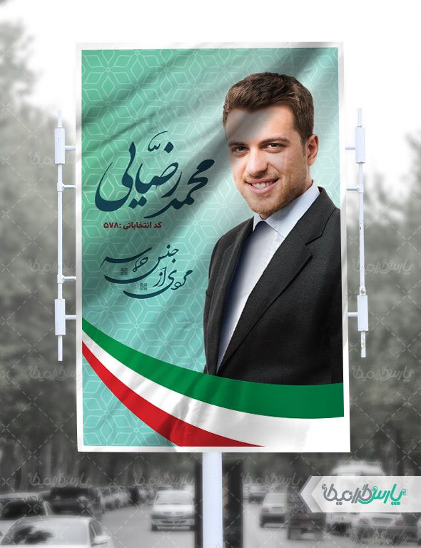 همانطور که در تصویر مشخص است از پرچم جمهوری اسلامی ایران در پس زمینه استفاده شده است و شما برای چاپ فقط کافی است تصویر نامزد انتخابات را جایگزین تصویر پیش فرض طرح کنید و نام نماینده را تغییر دهید.