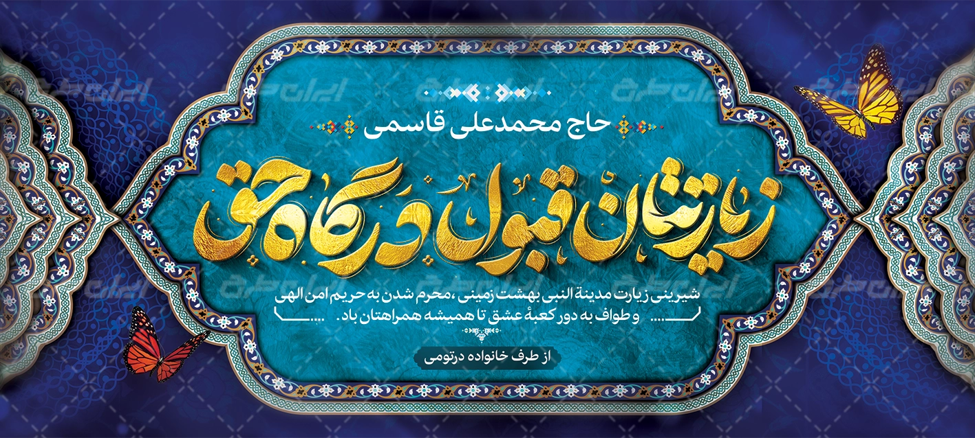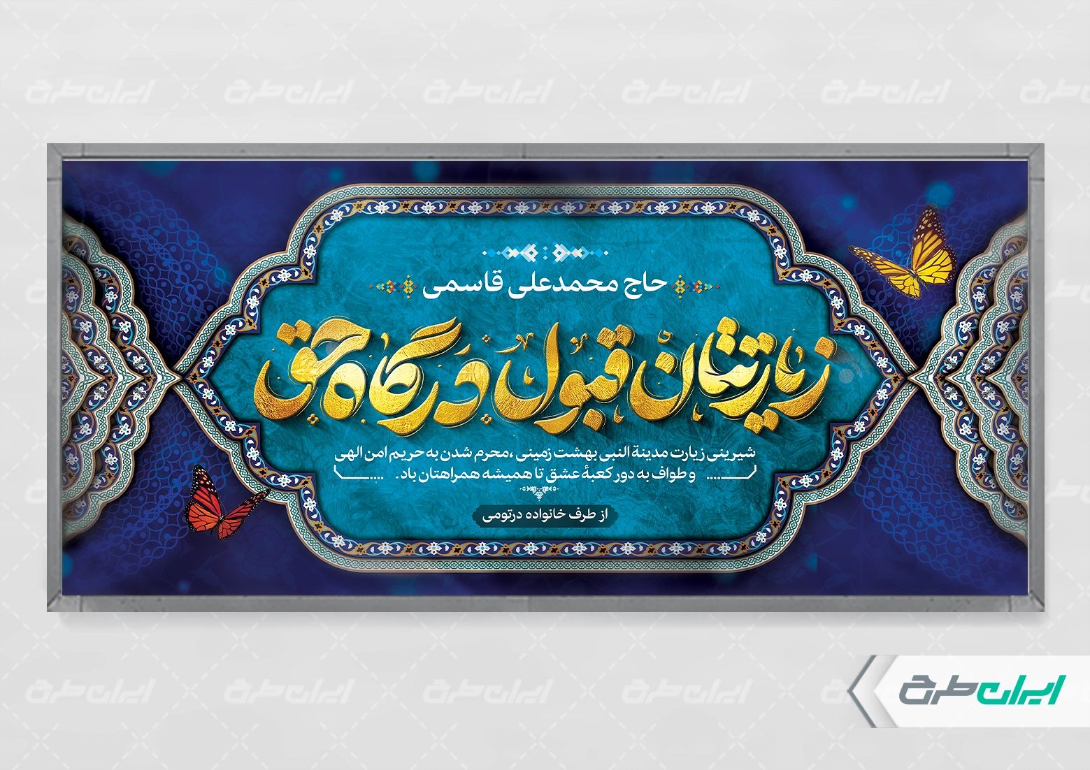 تایپوگرافی زیارتتان قبول درگاه حق، تصویر کعبه و طرح گل و متن خیر مقدم می باشد که توسط تیم ایران طرح طراحی شده است.