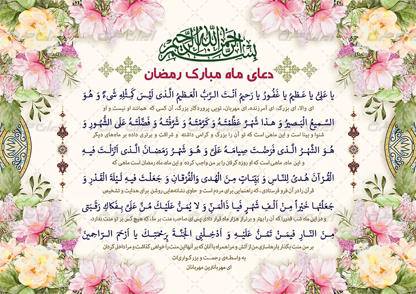 متن دعای روز اول ماه رمضان، طرح گل، تذهیب، نقوش مذهبی می باشد که توسط تیم ایران طرح طراحی شده است.