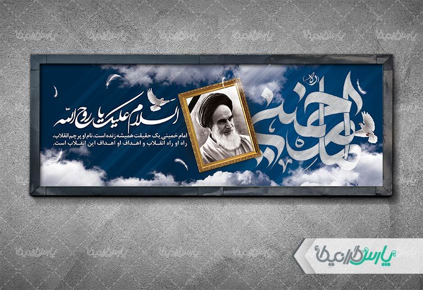 طرح لایه باز بنر رحلت امام خمین ره بصورت افقی با پس زمینه سورمه ای طراحی شده است .