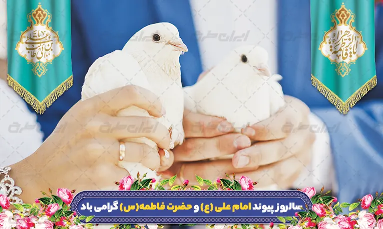 تصویر کبوتر و متن تبریک سالروز پیوند امام علی (ع) و حضرت فاطمه (س) می باشد که توسط تیم ایران طرح طراحی شده است.