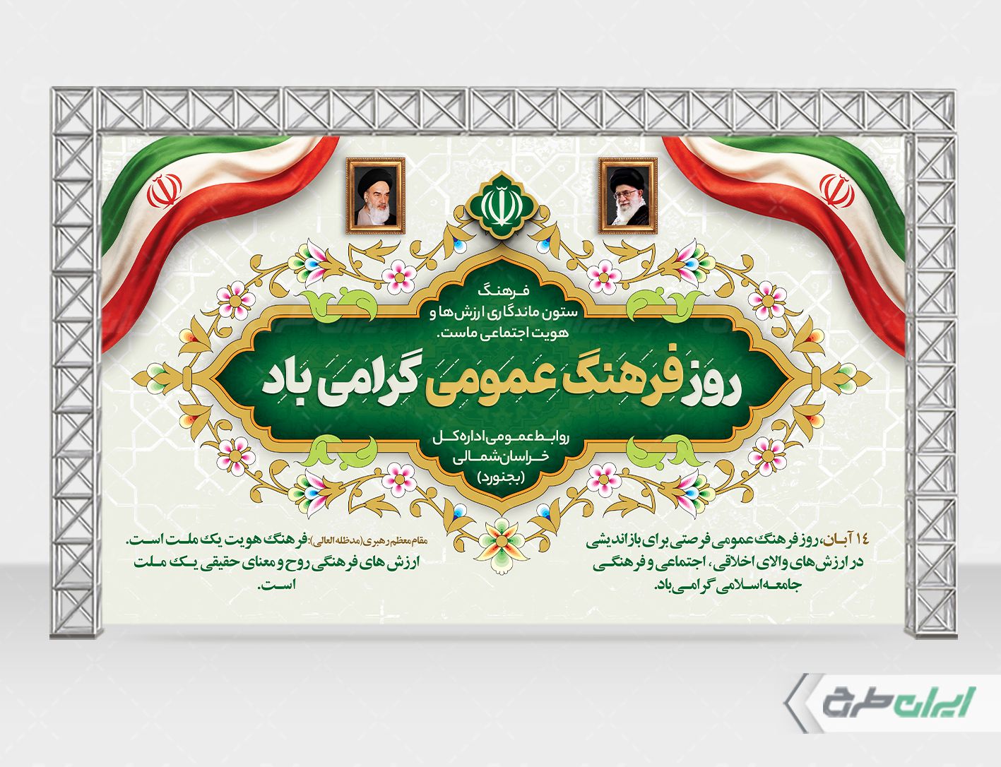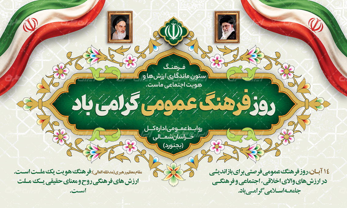 تصویر پرچم ایران و متن تبریک روز فرهنگ عمومی می باشد که توسط تیم ایران طرح طراحی شده است.