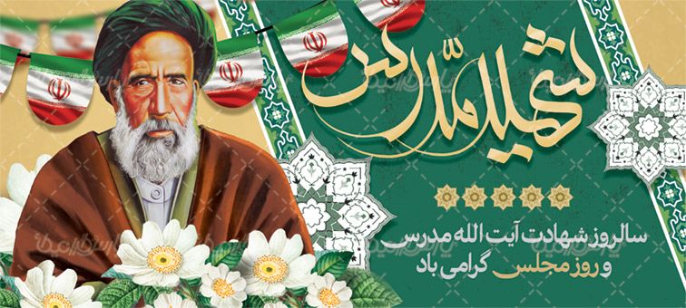 طرح بنر روز مجلس شورای اسلامی، بنر روز مجلس و شهادت آیت الله مدرس، بنر لایه باز روز مجلس شورای اسلامی، بنر مناسبتی، بنر لایه باز شهادت آیت الله مدرس، تایپوگرافی، تایپوگرافی شهید مدرس، عکس دیجیتالی آیت الله مدرس، پرچم ایران، طرح گل، تذهیب، متن سالروز شهادت آیت الله مدرس و روز مجلس