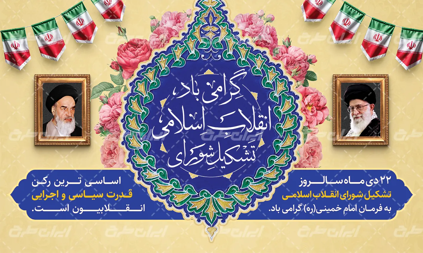 عکس آیت الله خامنه ای، تصویر پرچم ایران و متن گرامیداشت سالروز تشکیل شورای انقلاب اسلامی می باشد که توسط تیم ایران طرح طراحی شده است.