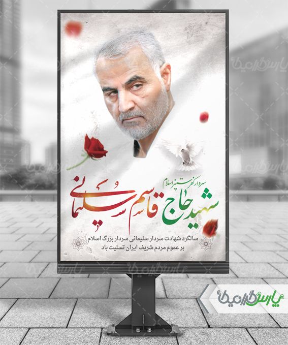 در طرح بنر لایه باز ترحیم از تصویر کبوتر و تصویر سردار شهید سلیمانی استفاده شده است .