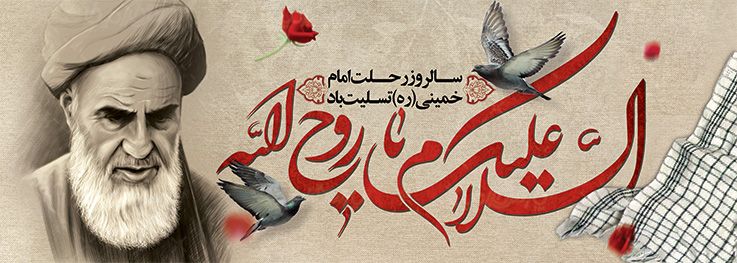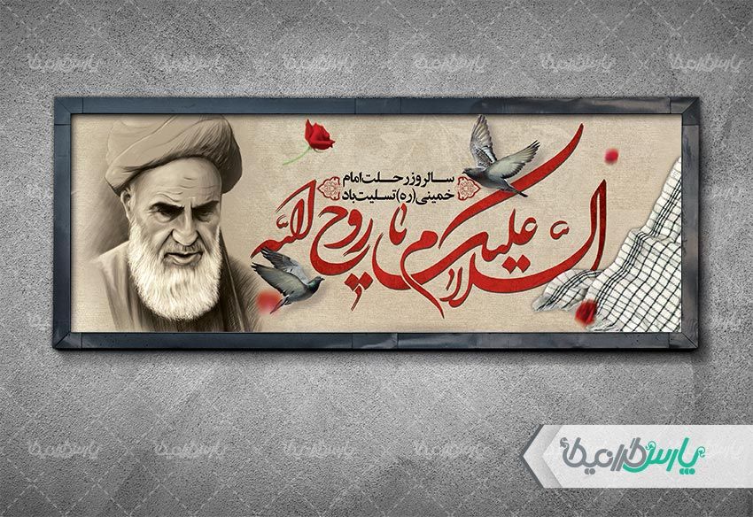 طرح لایه باز بنر رحلت امام خمین ره بصورت افقی با پس زمینه کرم طراحی شده است .