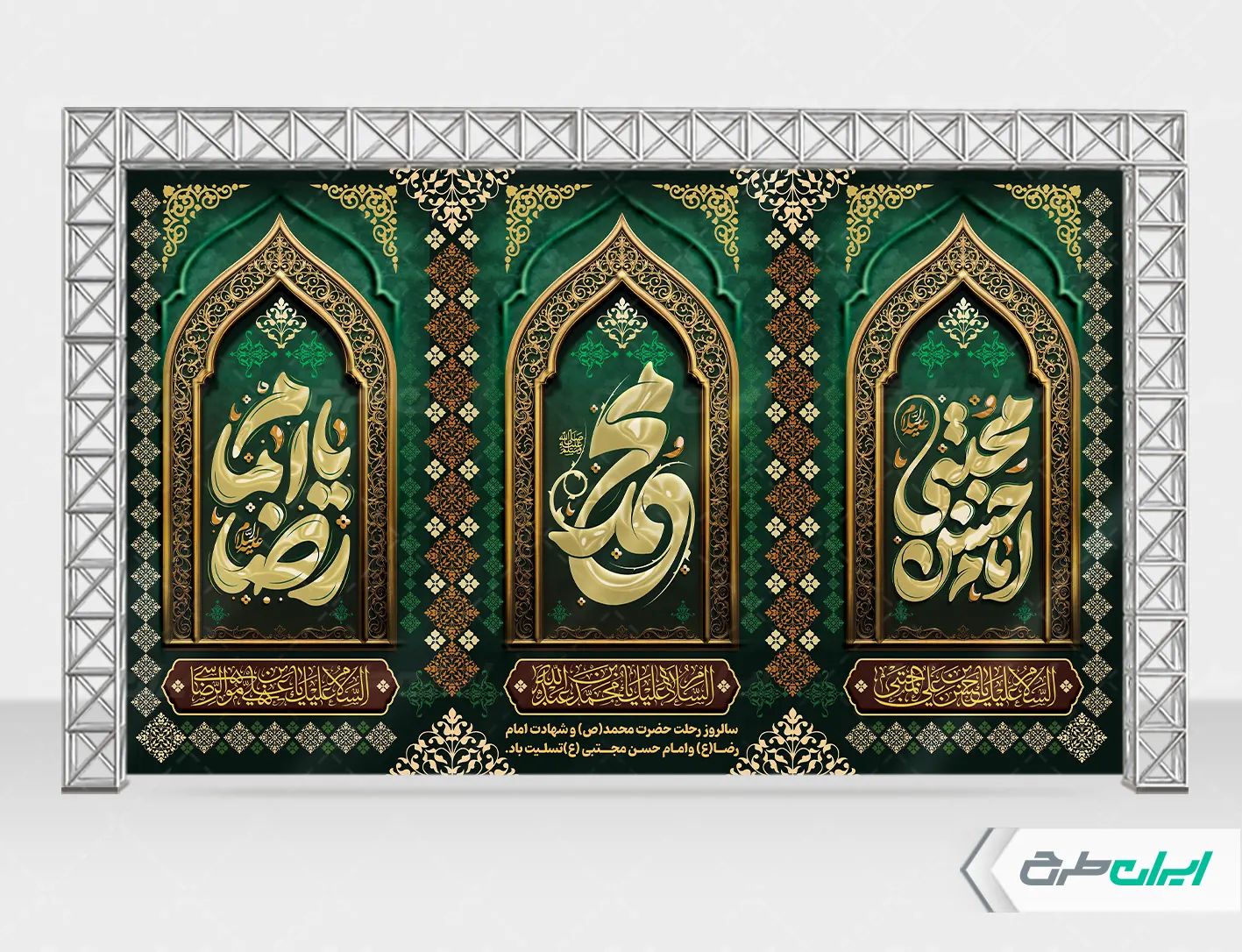 تذهیب، نقوش مذهبی و متن تسلیت رحلت پیامبر و شهادت امام حسن و امام رضا (ع) می باشد که توسط تیم ایران طرح طراحی شده است.