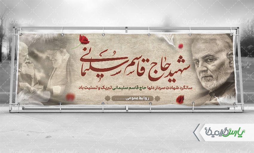 در طرح بنر لایه باز ترحیم از تصویر سردار شهید سلیمانی استفاده شده است .