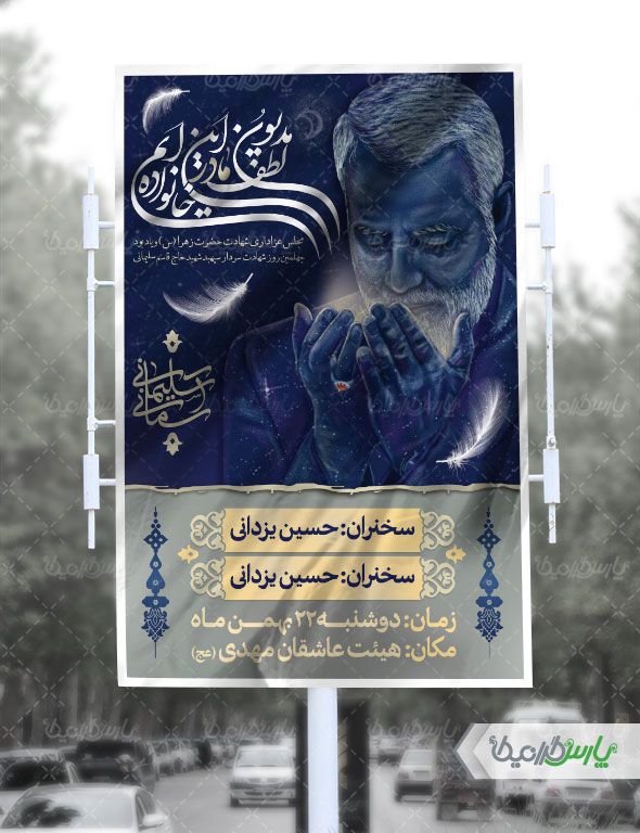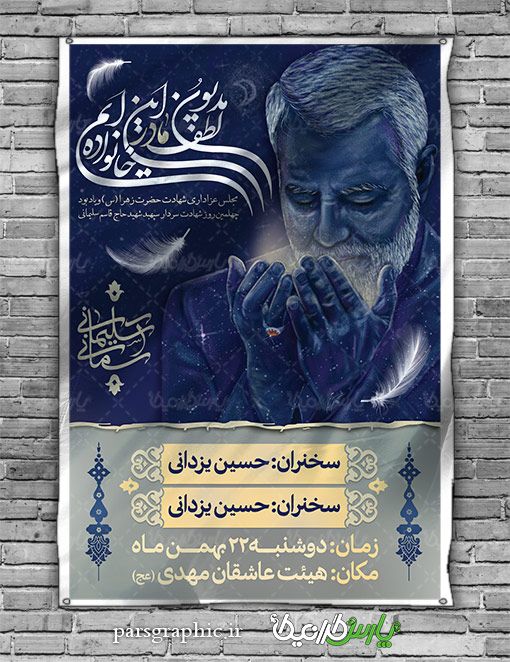 در طرح بنر لایه باز ترحیم از تصویر تصویر سردار شهید سلیمانی استفاده شده است .