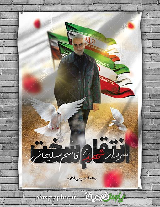 در طرح بنر لایه باز ترحیم از تصویر سردار شهید سلیمانی و پرچم ایران استفاده شده است .
