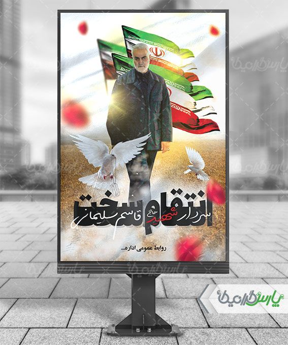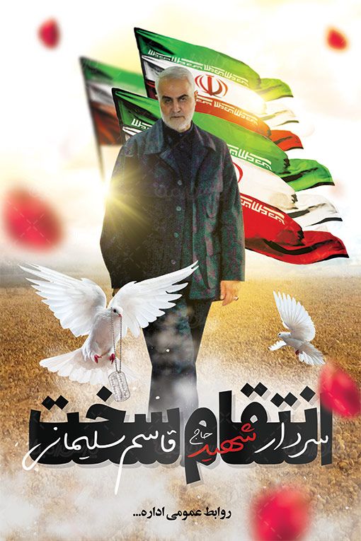در طرح بنر تسلیت شهادت سپهبد حاج قاسم سلیمانی از تایپوگرافی ( انتقام سخت) استفاده شده است.