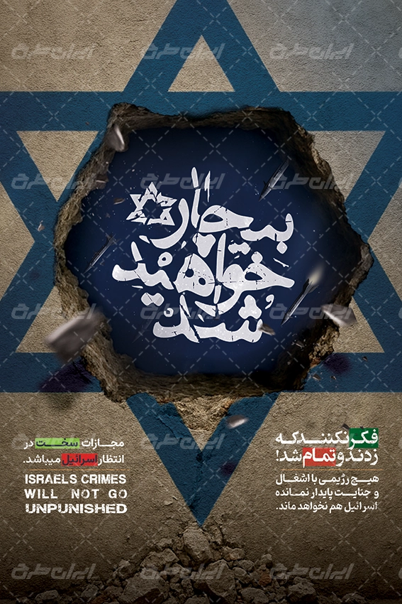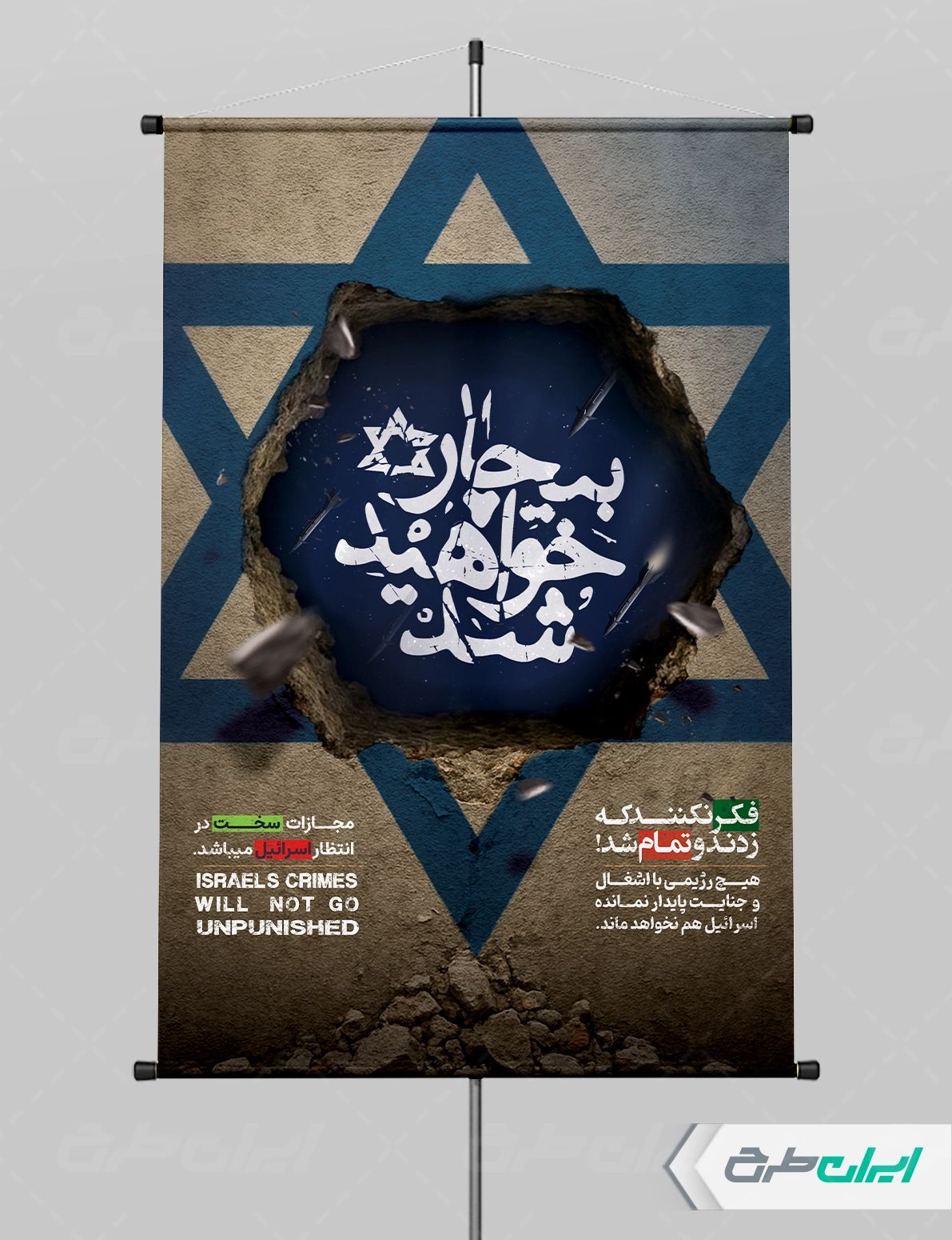 لوگوی اسرائیل و متن مرتبط با این حمله موشکی است که توسط تیم خلاق ایران طرح طراحی شده است.