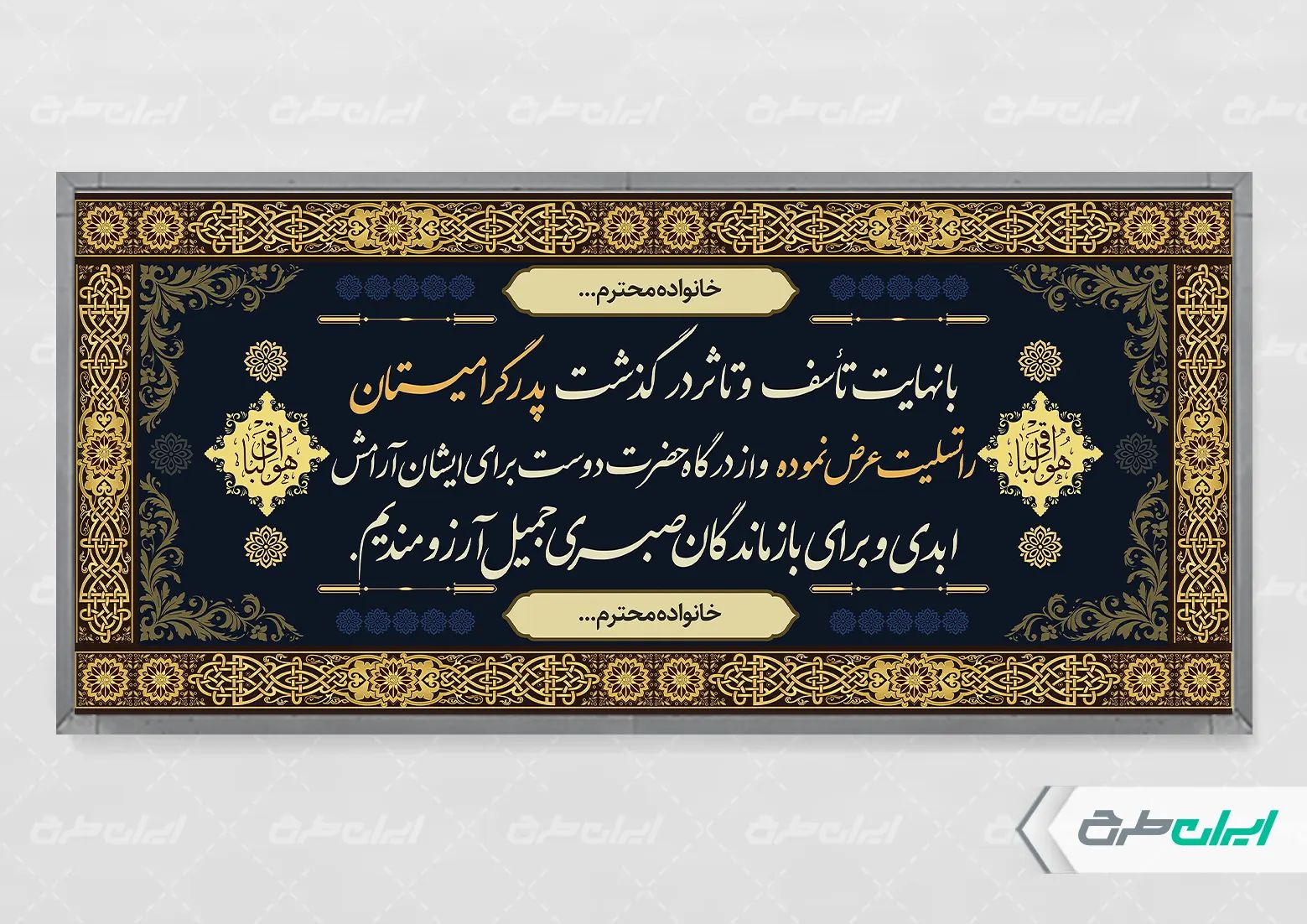 طرح بنر تسلیت ، توسط تیم حرفه ای ایران طرح جهت استفاده کاربران سایت طراحی و به صورت لایه باز در دسترس کاربران قرار گرفته است.