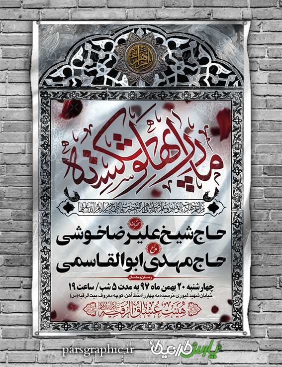 بنر لایه باز شهادت حضرت فاطمه , بنر منبر , بنر اطلاع رسانی مراسم دهه فاطمیه , بنر شهادت حضرت فاطمه , بنر دهه فاطمیه , طرح بنر دهه فاطمیه , شهادت حضرت فاطمه , دهه فاطمیه , بنر شهادت حضرت زهرا , بنر پشت منبر , طرح بنر شهادت حضرت فاطمه ,