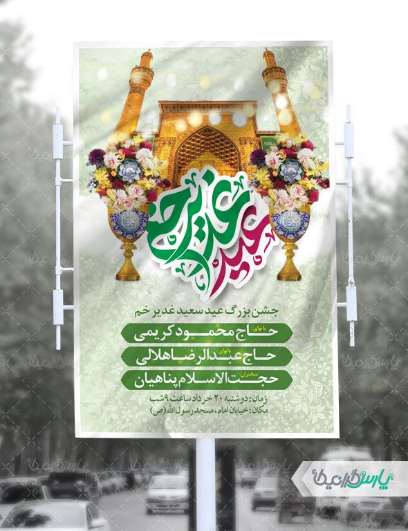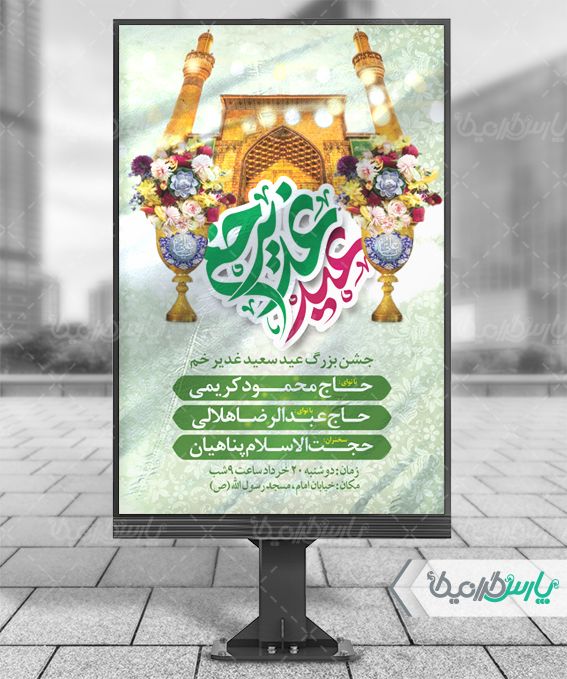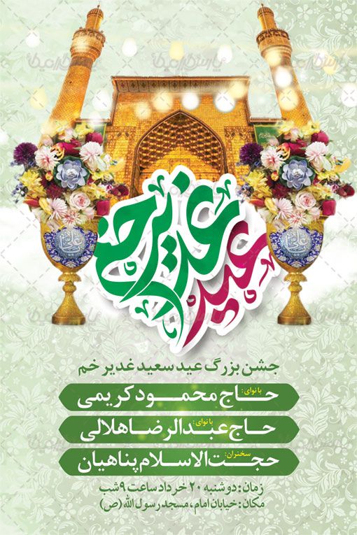 طرح بنر عید غدیر خم شامل: تصویر حرم و گل و متن مرتبط با مراسم عید غدیر خم می باشد که توسط طراحان پارس گرافیک در نرم افزار فتوشاپ طراحی شده است. به دلیل استفاده از عناصر و المان های با کیفیت در طرح بنر مناسبتی ، می توانید علاوه بر چاپ بنر (به صورت افقی)، در استوری اینستاگرام و یا دیگر پلت فرم های فضای مجازی استفاده نمایید. ضمنا به دلیل لایه باز بود طرح بنر روز ازدواج می توانید با استفاده از نرم افزار فتوشاپ تغییرات دلخواه خود را اعمال کنید.