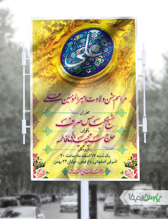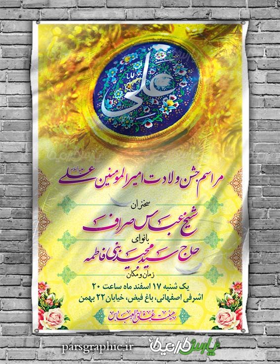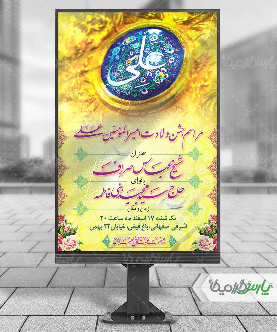 طرح بنر ولادت حضرت علی (ع) بصورت عمودی طراحی شده با پس زمینه زرد رنگ طراحی شده است.