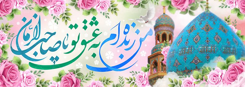 - طراحی بنر با استفاده از تذهیب و طرح گل و تصویر جمکران