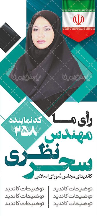 بنر لایه باز انتخابات به صورت استند طراحی شده در طرح تصویر نامزد انتخابات جایگزاری میشود.