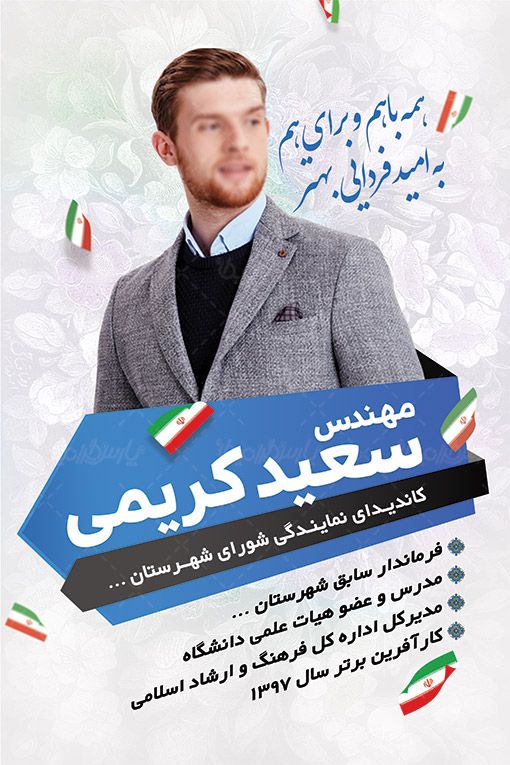 همانطور که در تصویر مشخص است از پرچم جمهوری اسلامی ایران و گل و مرغ در پس زمینه استفاده شده است و شما برای چاپ فقط کافی است تصویر نامزد انتخابات را جایگزین تصویر پیش فرض طرح کنید و نام نماینده را تغییر دهید.