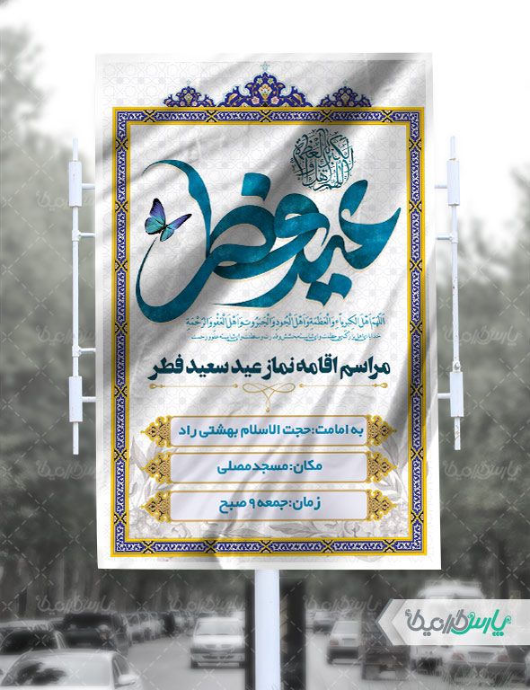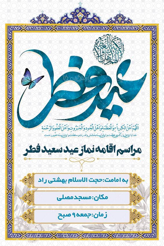 بنر لایه باز مراسم اقامه نماز عید سعید فطر بصورت عمودی و با پس زمینه سفید طراحی شده.