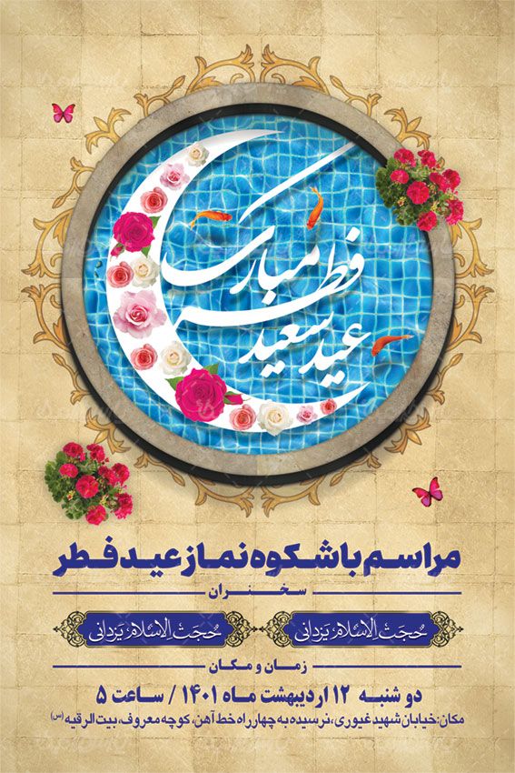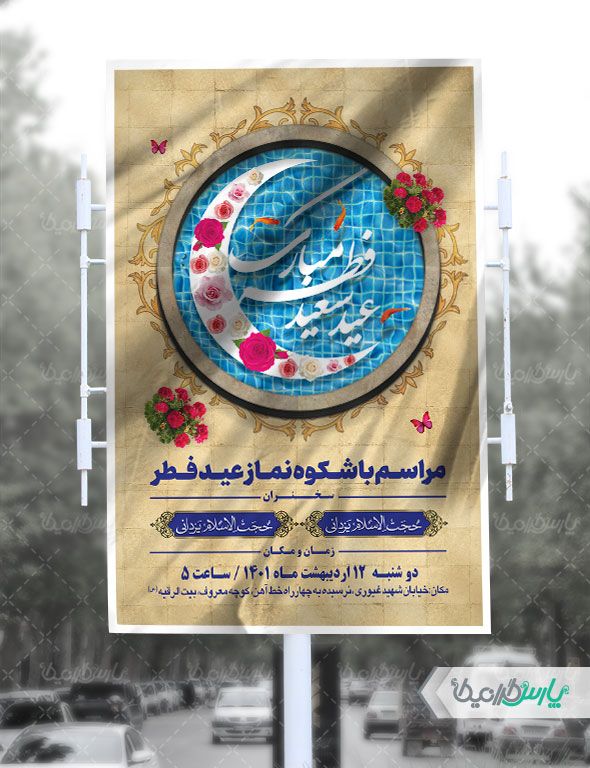 طرح بنر عید فطر شامل:تصویر حوض ، پروانه و گل و متن اطلاع رسانی نماز عید فطر می باشد که توسط تیم پارس گرافیک طراحی شده است. به دلیل استفاده از عناصر و المان های با کیفیت در طرح بنر مناسبتی ، می توانید علاوه بر چاپ بنر (به صورت افقی)، در استوری اینستاگرام و یا دیگر پلت فرم های فضای مجازی استفاده نمایید. ضمنا به دلیل لایه باز بود طرح بنر عید فطر می توانید با استفاده از نرم افزار فتوشاپ تغییرات دلخواه خود را اعمال کنید.