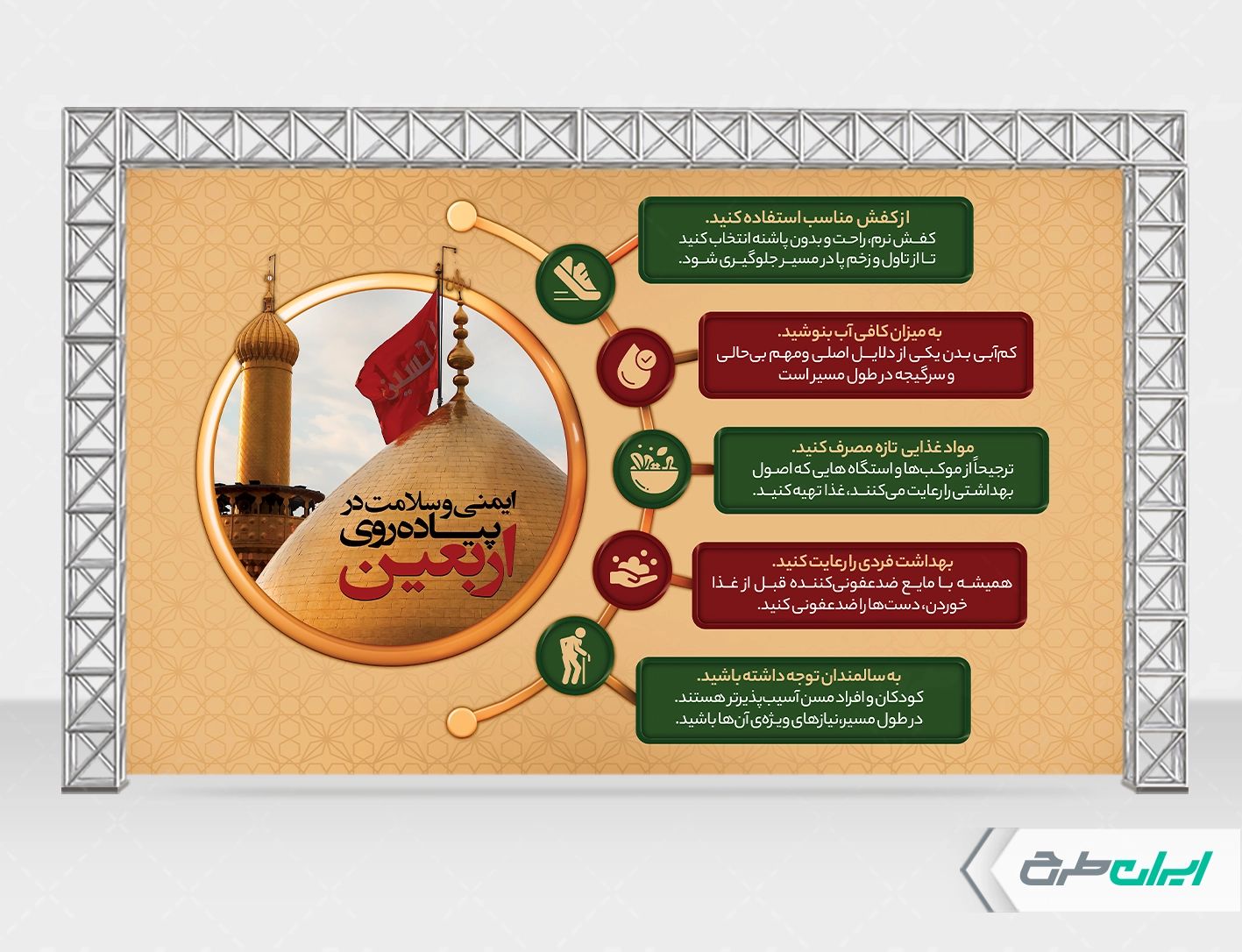 نکات ایمنی و سلامت در پیاده روی اربعین و متن تسلیت اربعین حسینی می باشد که توسط طراحان ایران طرح در نرم افزار فتوشاپ طراحی شده است.