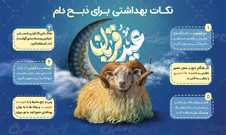 بنر تبریک نکات بهداشتی در عید قربان به مناسبت این عید باشکوه و خجسته توسط ایران طرح طراحی، و در دسترس کاربران سایت قرار گرفته شده است.