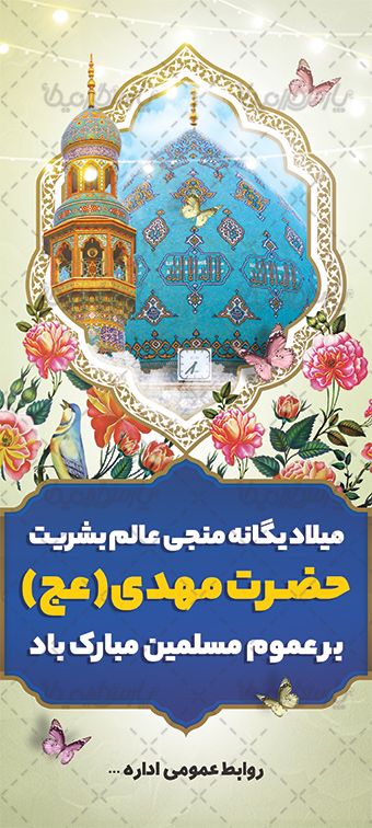 طرح بنر ولادت امام مهدی شامل: حرم ، گل ، پروانه و متن گرامیداشت ولادت امام مهدی (عج) می باشد که توسط تیم پارس گرافیک طراحی شده است. به دلیل استفاده از عناصر و المان های با کیفیت در طرح بنر مناسبتی ، می توانید علاوه بر چاپ بنر (به صورت افقی)، در استوری اینستاگرام و یا دیگر پلت فرم های فضای مجازی استفاده نمایید. ضمنا به دلیل لایه باز بود طرح بنر ولادت امام مهدی (عج) می توانید با استفاده از نرم افزار فتوشاپ تغییرات دلخواه خود را اعمال کنید.