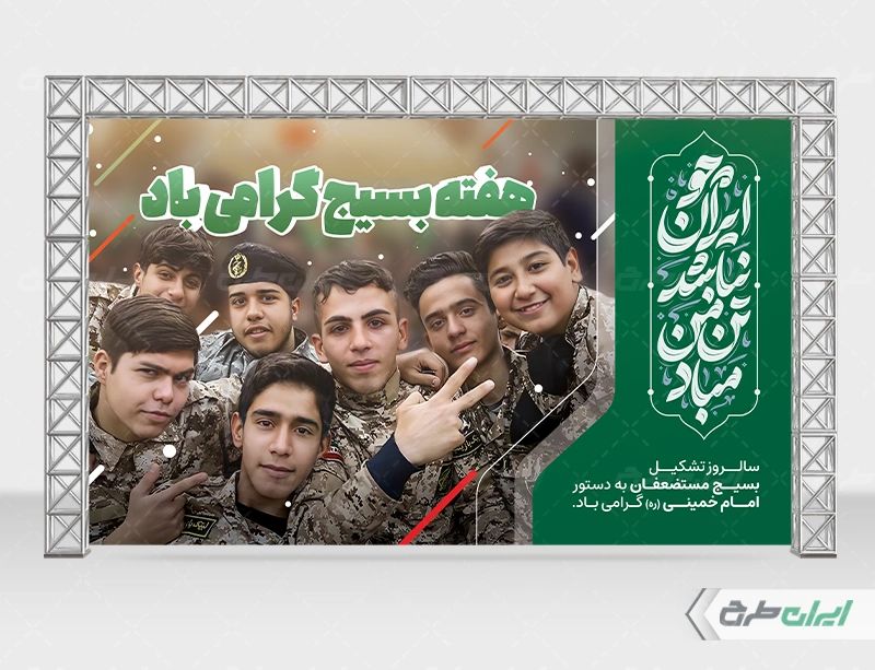 بنر لایه باز تبریک هفته بسیج، توسط تیم حرفه ای ایران طرح جهت استفاده کاربران سایت طراحی و به صورت لایه باز در دسترس کاربران قرار گرفته است.