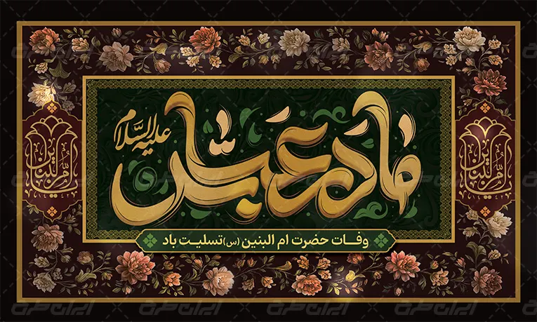 بنر لایه باز رحلت ام البنین , ام عباس , دانلود بنر وفات حضرت ام البنین , بنر شهادت حضرت ام البنین , رحلت حضرت ام البنین , بنر تکریم مادران و همسران شهدا , طرح بنر وفات ام البنین , تایپوگرافی مادر عباس , طرح بنر تکریم ماردان و همسران شهدا , تکریم مادران شهدا , ام البنین , تذهیب , بنر وفات حضرت ام البنین ,