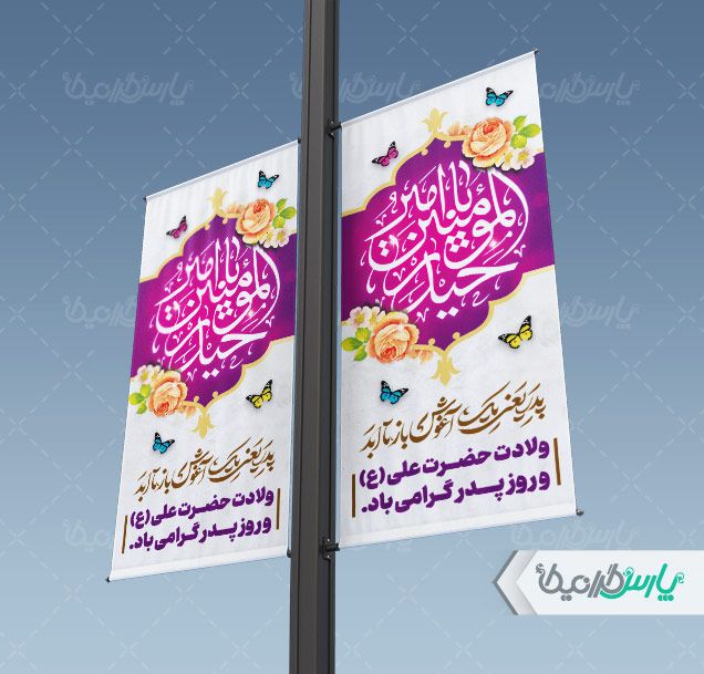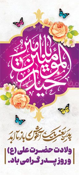 - هم نشینی مناسب رنگ بنفش و سفید با طرح بنر ولادت امام علی (ع)