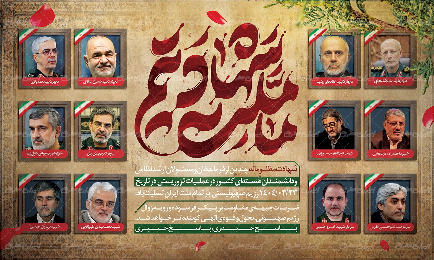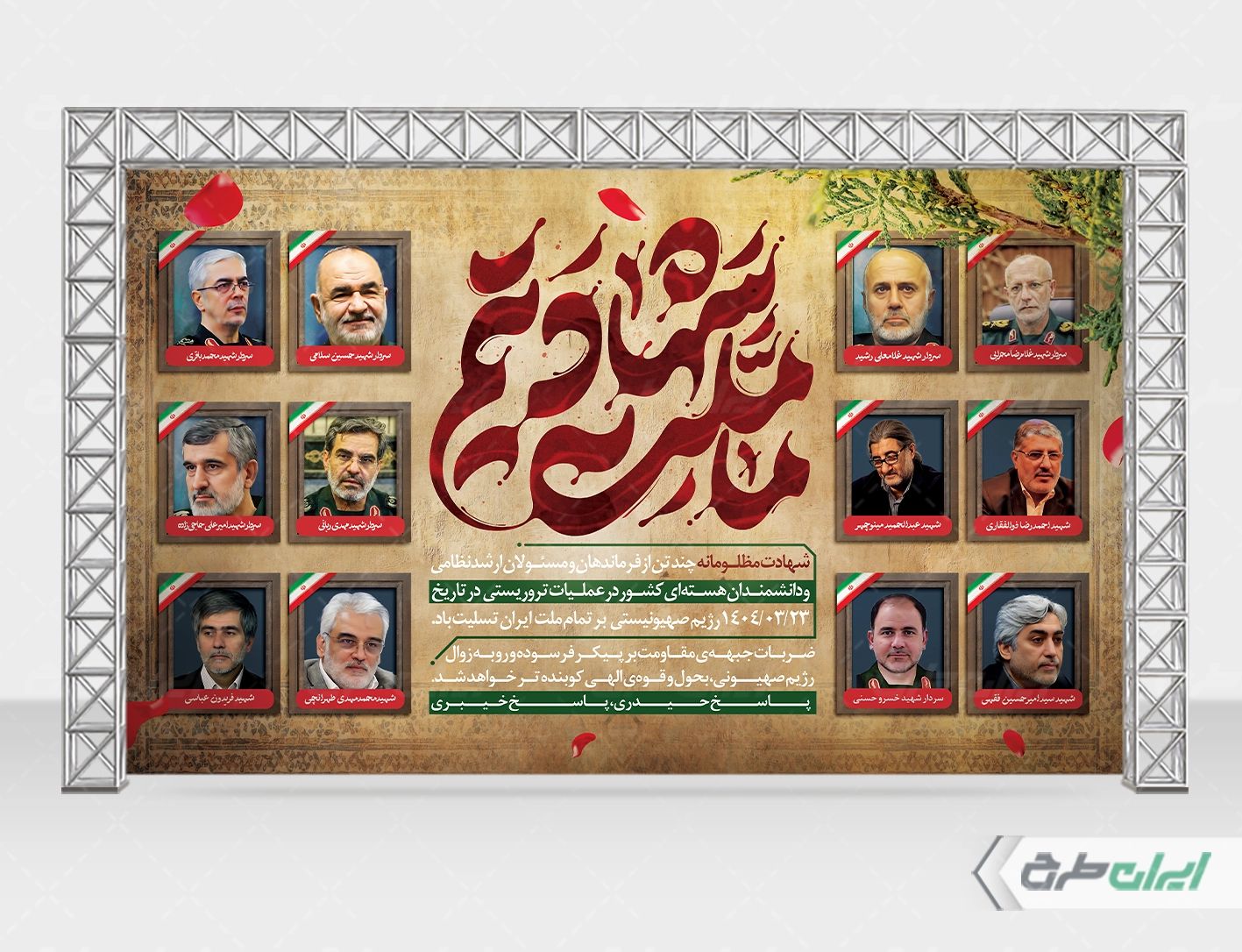 بنر پشت سن حمله تروریستی اسرائیل و شهادت فرماندهان سپاه
