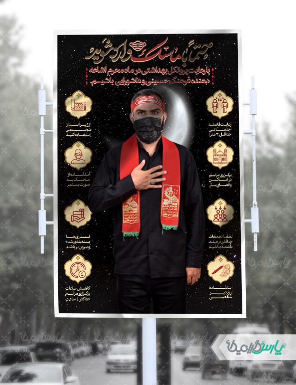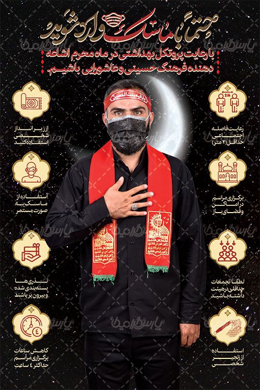 طرح بنر استند شهری محرم، بنر استند شهری لایه باز محرم، طرح لایه باز بنر ایام محرم، تصویر با کیفیت از عزادار حسینی با ماسک، تصویر مفهومی از رعایت شیوه نامه های بهداشتی در مراسم عزاداری محرم، متن لطفا با ماسک وارد شوید، وکتور ماسک، زمینه آسمان و ماه، شیوه نامه های بهداشتی برگزاری مراسم های سوگواری، متن با رعایت شیوه نامه های بهداشتی در ماه محرم اشاعه دهنده فرهنگ عاشورایی باشیم