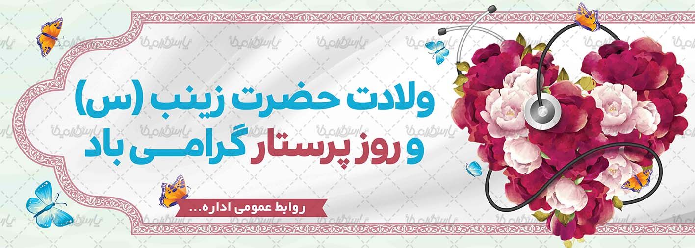 طرح بنر روز پرستار ، بنر روز پرستار و ولادت حضرت زینب(س)، بنر لایه باز روز پرستار ، بنر مناسبتی، بنر لایه باز ولادت حضرت زینب(س)، گوشی پزشکی، طرح قلب، کادر مذهبی، کادر تذهیب، کادر اسلیمی، طرح گل، متن گرامیداشت روز پرستار