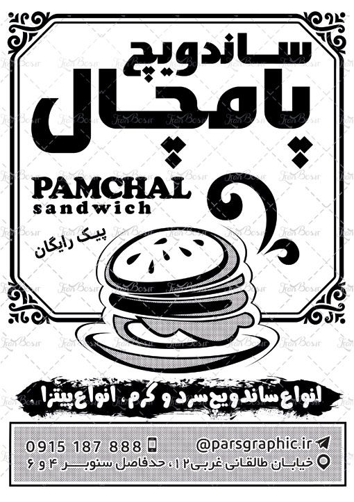 در طرح تراکت فست فود از وکتور با کیفیت ساندویچ استفاده شده است .