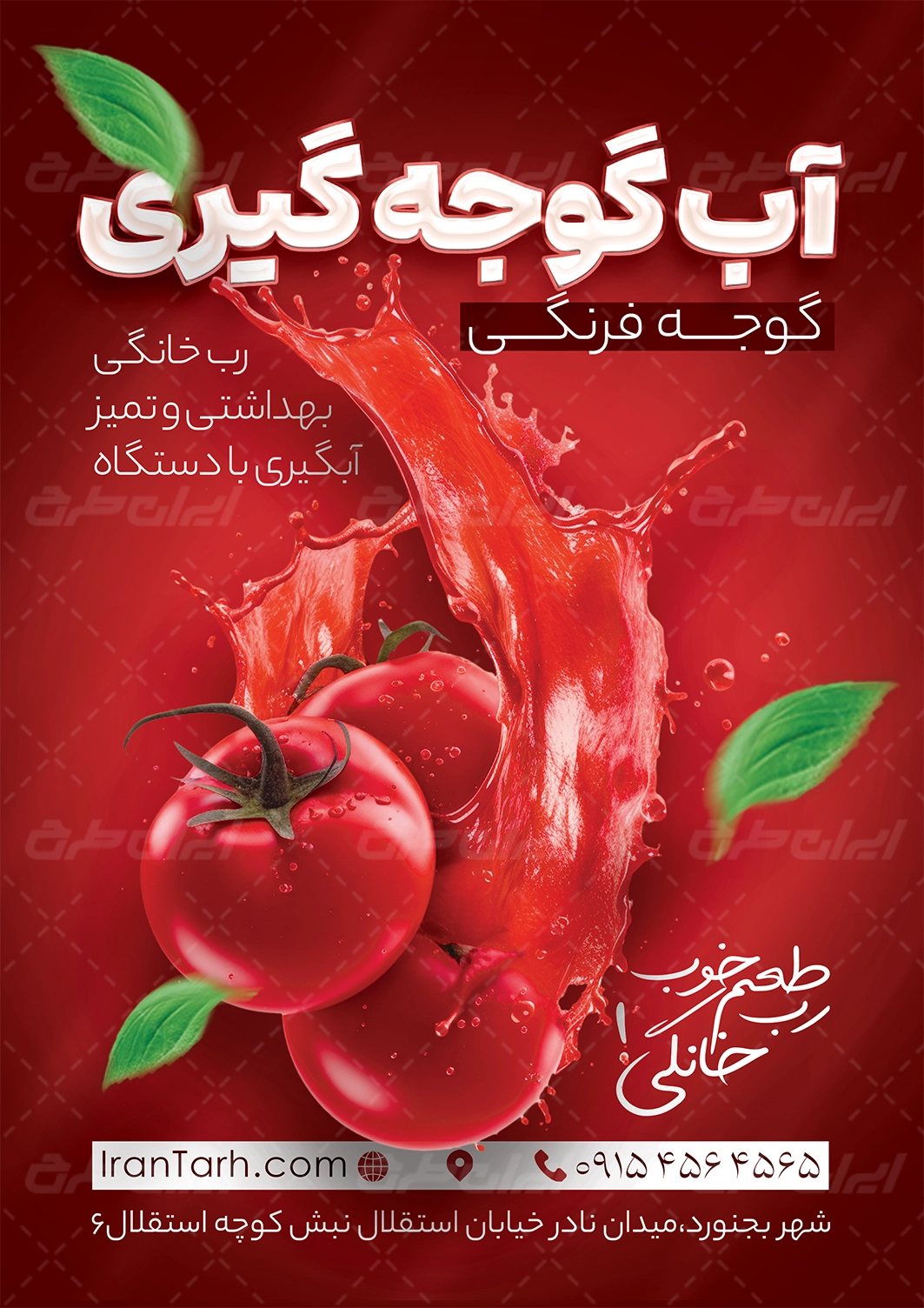 - استفاده مناسب از تصویر گوجه فرنگی در طرح تراکت آب گوجه گیری