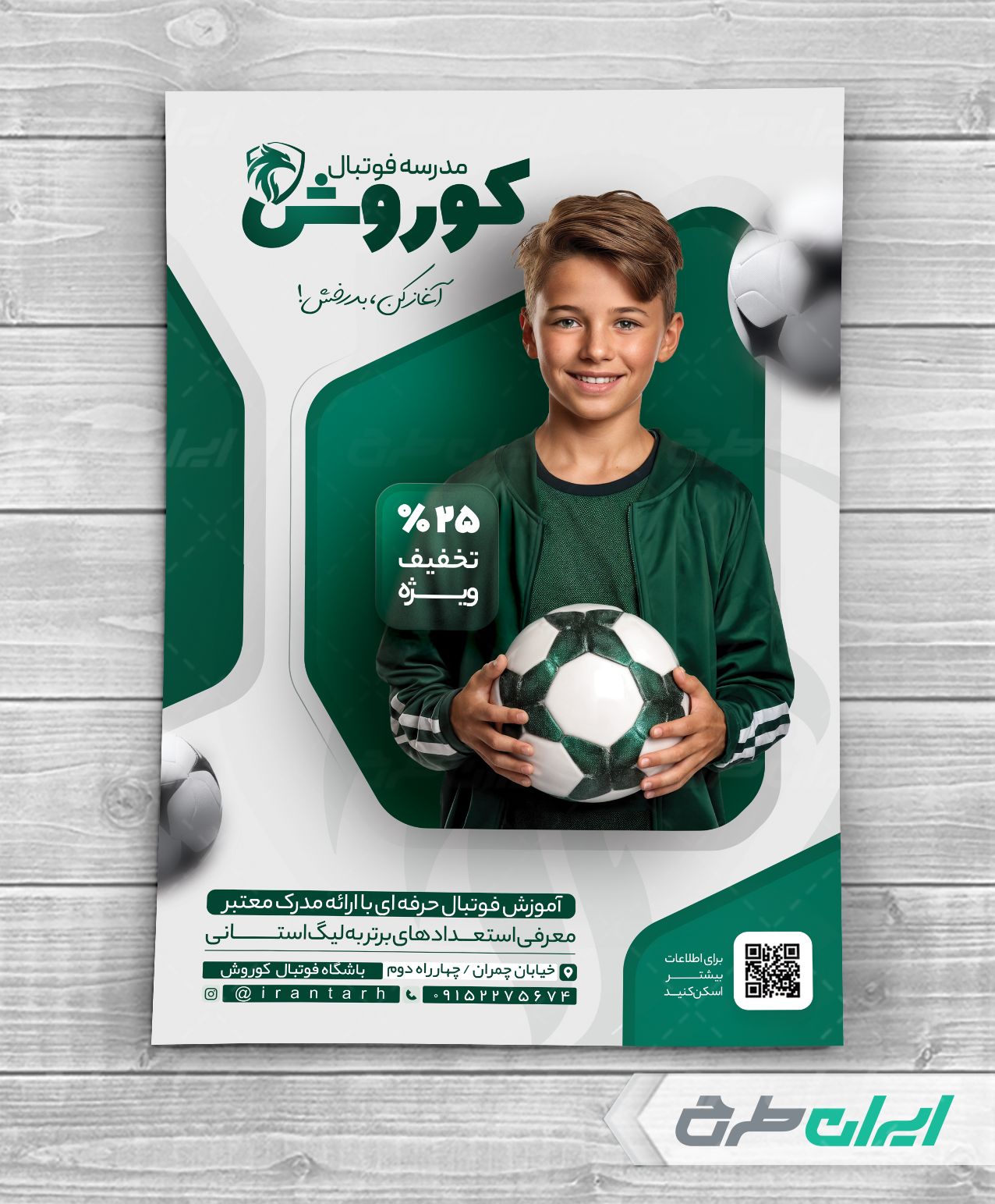 طرح تراکت لایه باز مدرسه فوتبال، جهت بازاریابی و تبلیغات این کلاس ها توسط ایران طرح طراحی و در اختیار کاربران سایت قرار گرفته است.