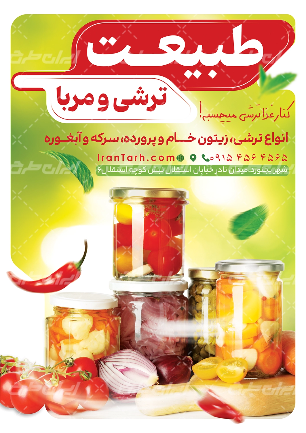 طرح تراکت فروشگاه ترشی و مربا شامل: