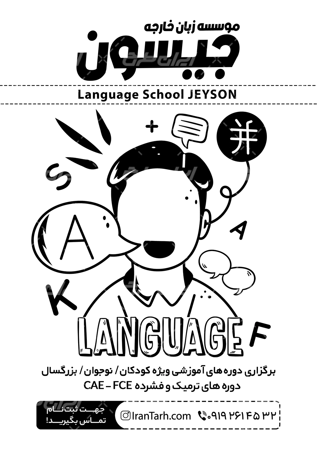 - طراحی شیک و کاربردی تراکت سیاه و سفید موسسه زبان