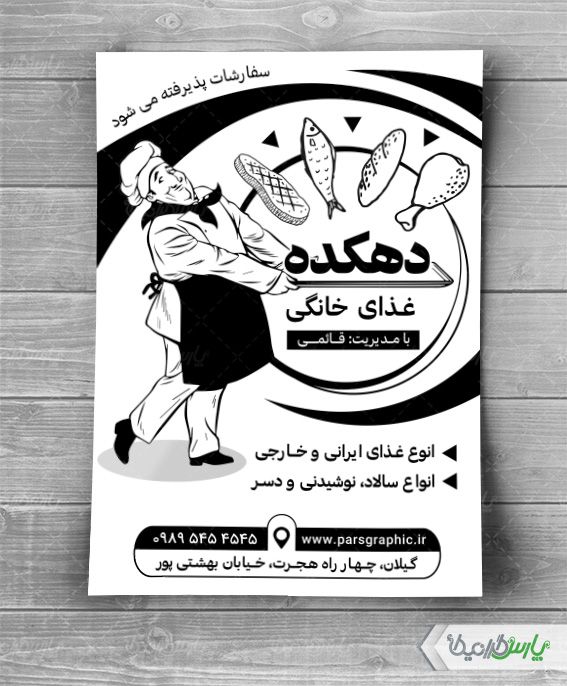 همانطور که در تصویر پیش نمایش مشخص است تراکت رستوران بصورت سیاه سفید و مناسب چاپ با دستگاه ریسو گرافی طراحی شده و در طرح از تصویر سرآشپز و منوی رستوران استفاده شده است.